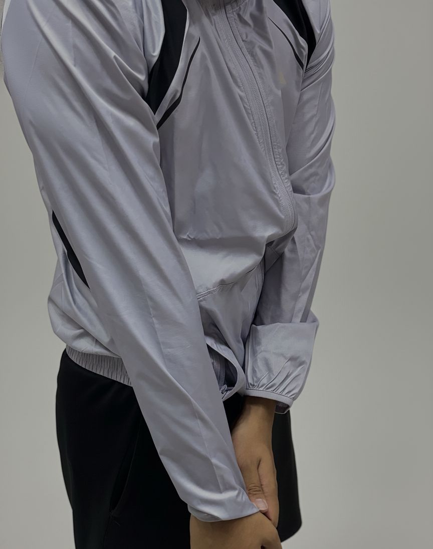 Luce un look impecable mientras te proteges del clima! Esta chamarra ligera de la marca Adidas destaca por su diseño minimalista en color gris claro con detalles en contraste, ofreciendo un ajuste cómodo y una estética contemporánea.